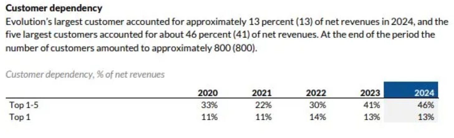 El top clientes son operadores: En este caso el riesgo es mayor, ya que son operadores reales en mercados regulados donde los operadores pueden ganar una mayor fidelidad con los jugadores, el riesgo de dependencia de Evolution definitivamente aumenta y perderían pricing power.