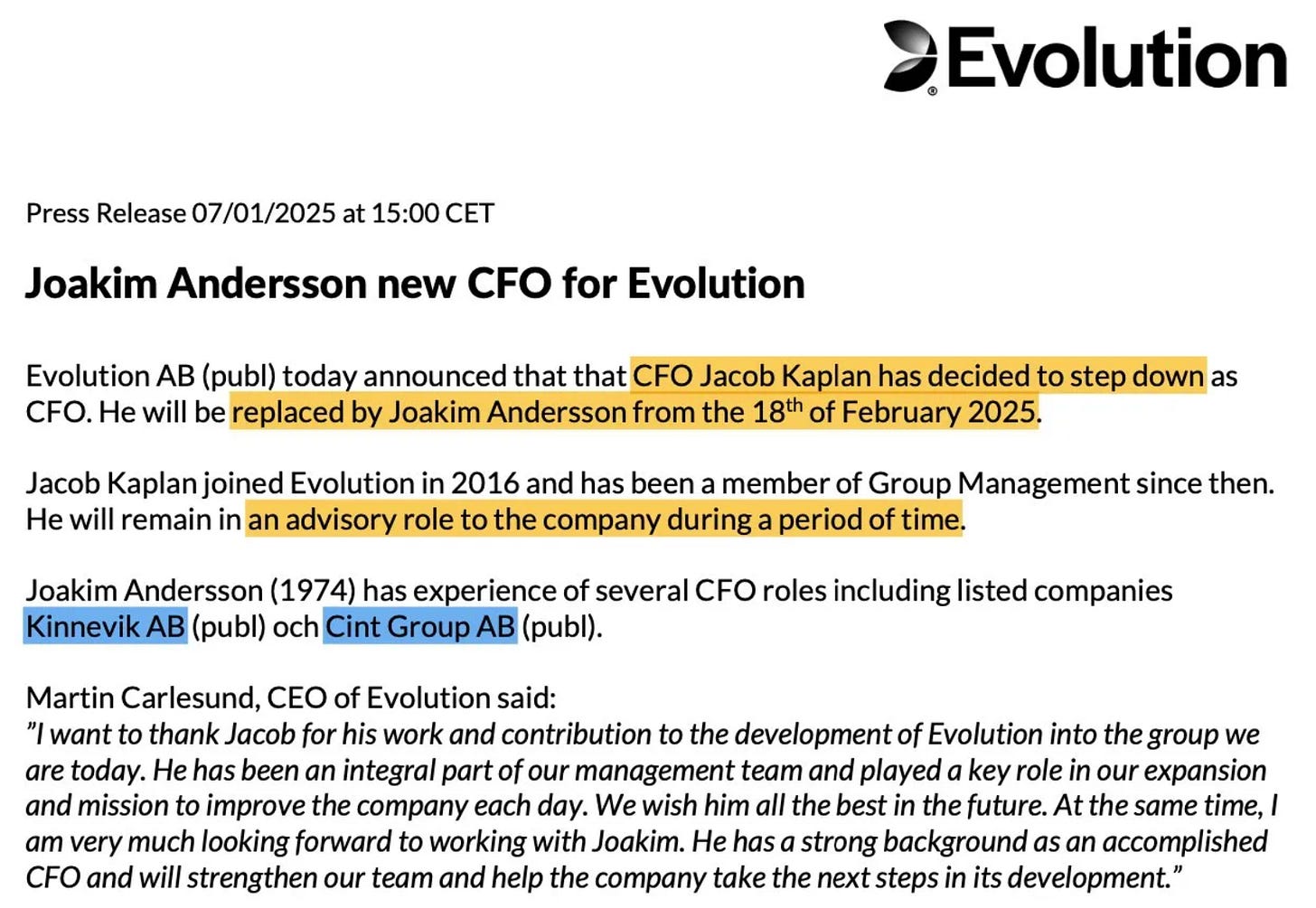 Evolution ha anunciado que Jacob Kaplan ha decidido dejar su posición de CFO y ser reemplazado por Joakim Andersson.