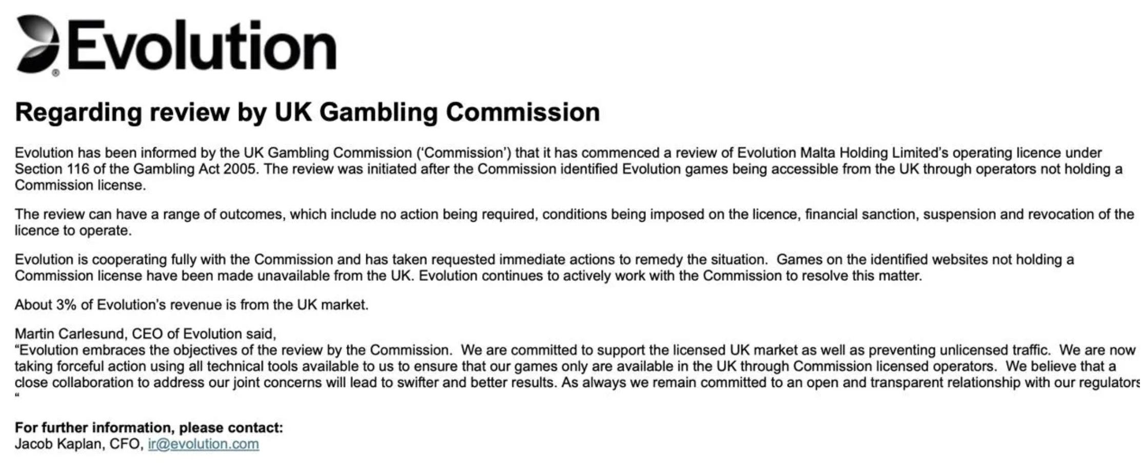 La UK Gambling Commission (Comisión de Juego del Reino Unido) ha iniciado una revisión regulatoria sobre Evolution ($EVO) debido a que algunos de sus juegos estaban siendo accesibles en el Reino Unido a través de operadores sin licencia.