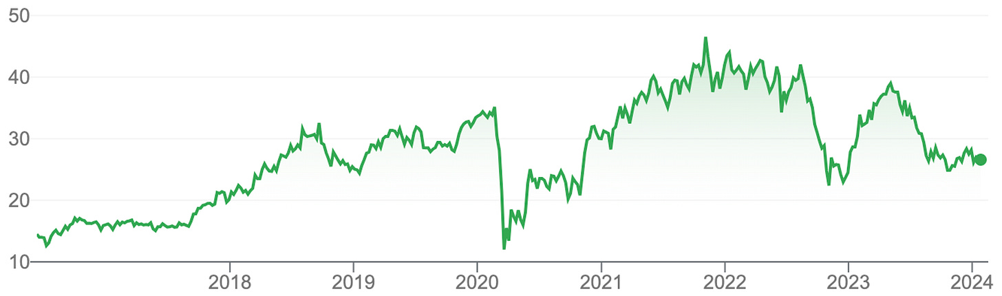 Este escenario produce un retorno del 24% anual a 7 años si esto se cumpliera (obviamente me puedo estar equivocando) y la empresa estaría cotizando a solo 9x FCF de 2024 y a 4,5x FCF de 2030 si consiguiera sus objetivos.