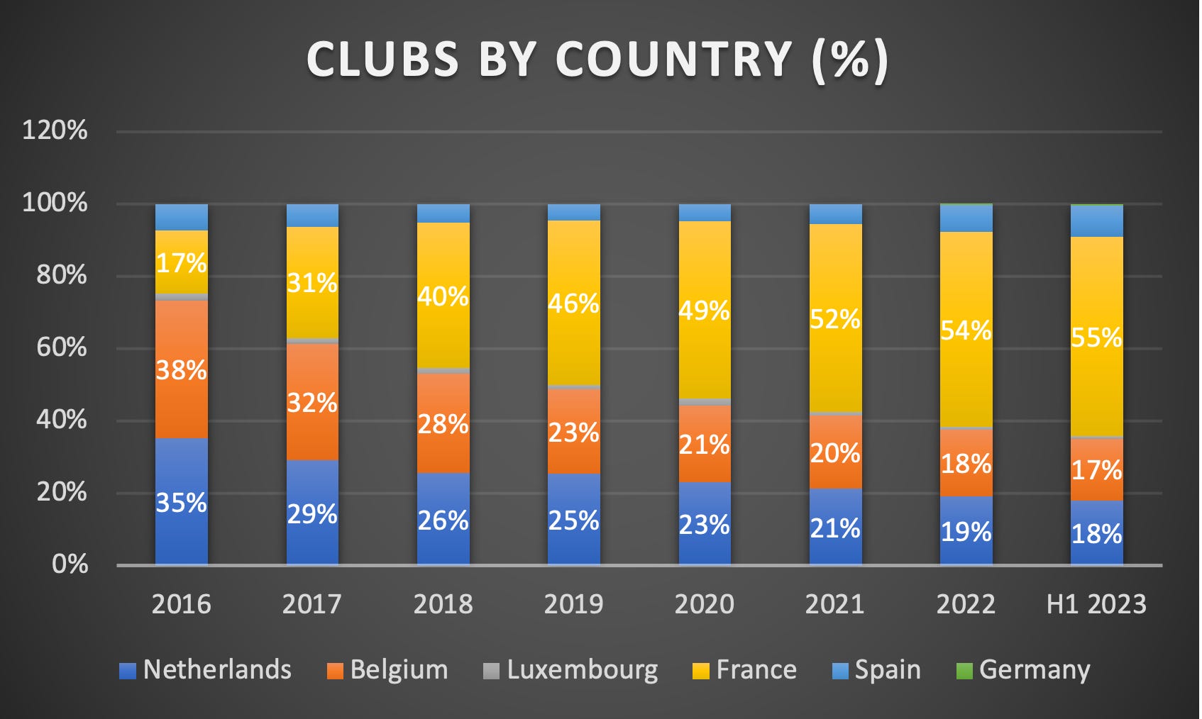 La compañía los últimos años se ha centrado en Francia, por eso que el peso de los clubes franceses ha pasado del 17% al 55%, y esto ha hecho rebajar el peso a Bélgica, incluso a España, siendo de los países que más crece.
