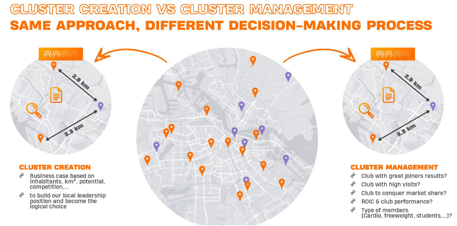 Este cluster aumenta la durabilidad del posicionamiento de los gimnasios, pero a expensas de menores retornos incrementales, dado que el territorio es operado por una base de costes más alta.