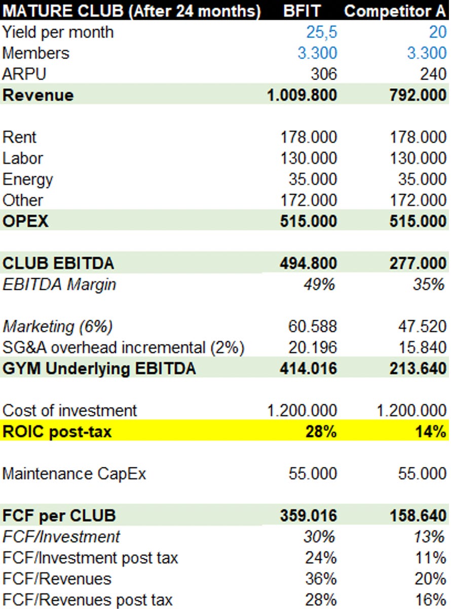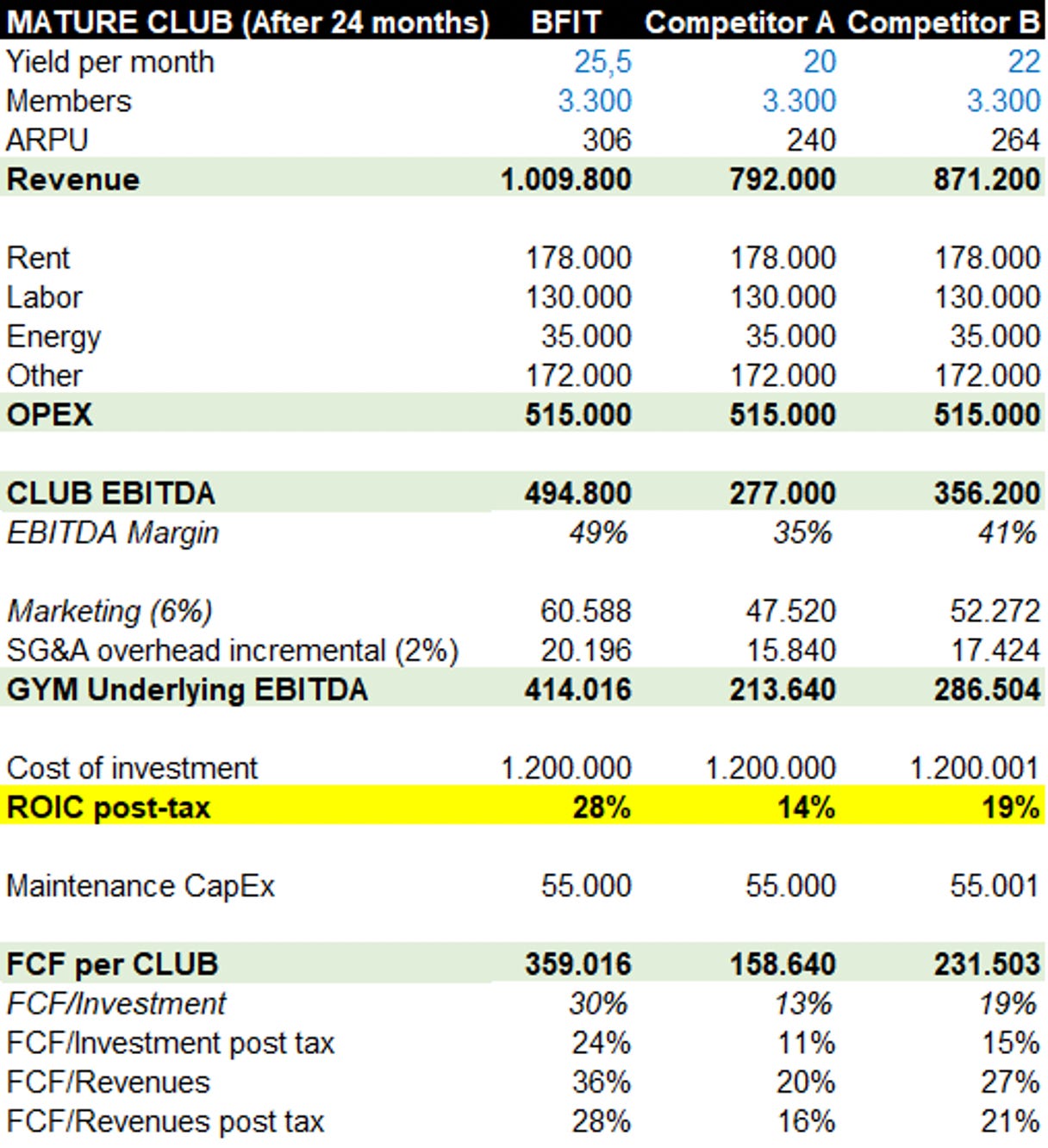 Si asumimos que existe un competidor que está intentando replicar a Basic Fit en una región. Como hemos dicho, BFIT, lo más probable es que tenga costes más bajos, por lo que ya directamente el competidor tendrá que obtener peores retornos. Sin embargo, vamos a suponer para hacerlo más conservador que sigue con los mismos costes.