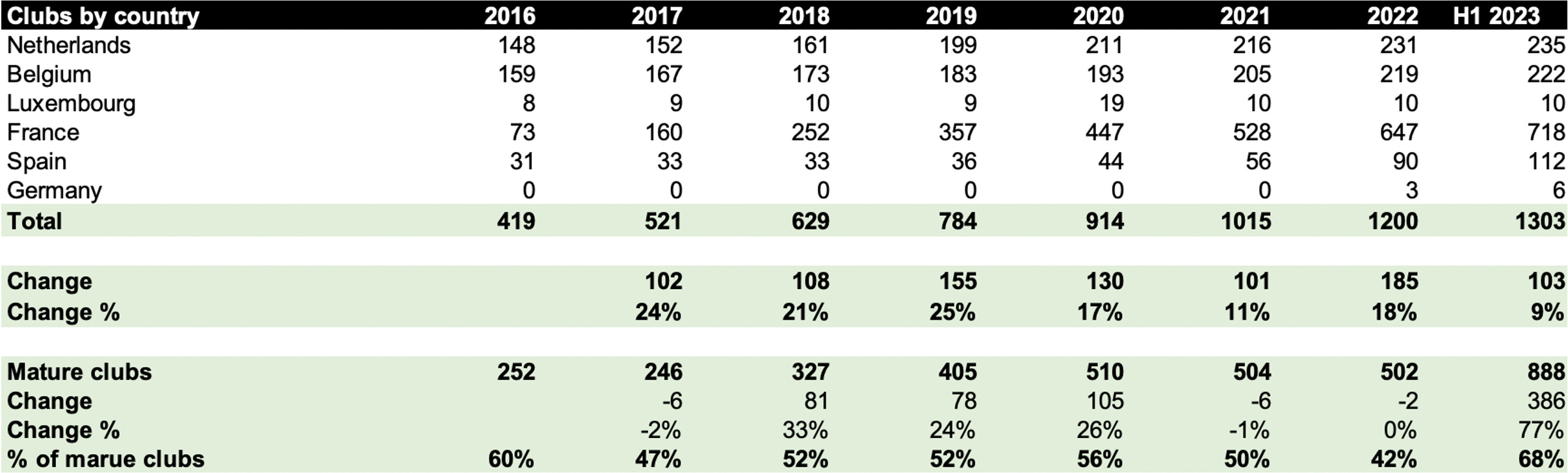 Actualmente, el porcentaje de clubes maduros es del 70% sobre el total. Los últimos años desde la pandemia, el porcentaje de clubes maduros se ha mantenido más bajo debido a que ajustaron temporalmente su definición de “club maduro” y solo incluyeron clubes que ya habían alcanzado la madurez al comienzo de la primera ola de contagios en marzo de 2020.
