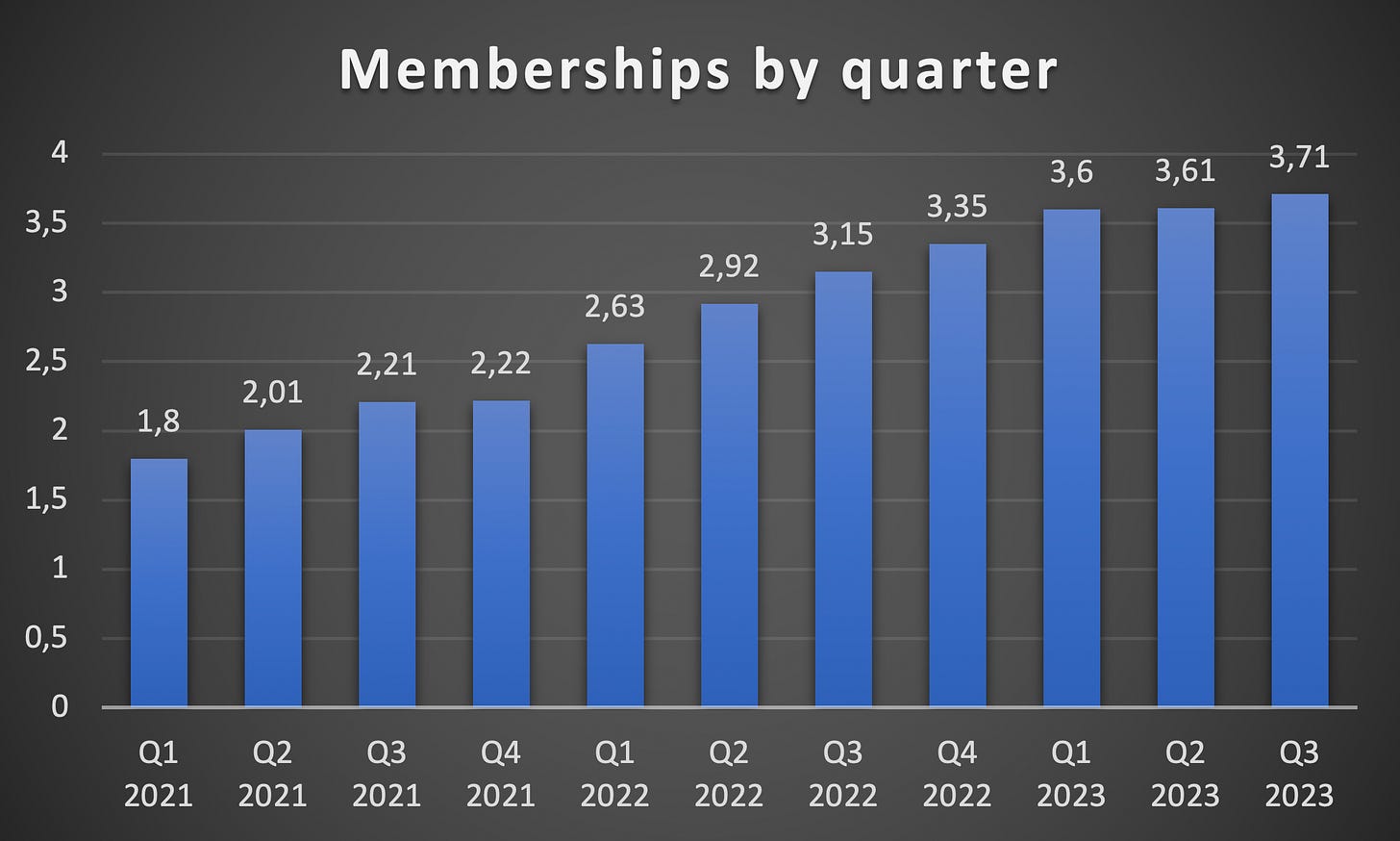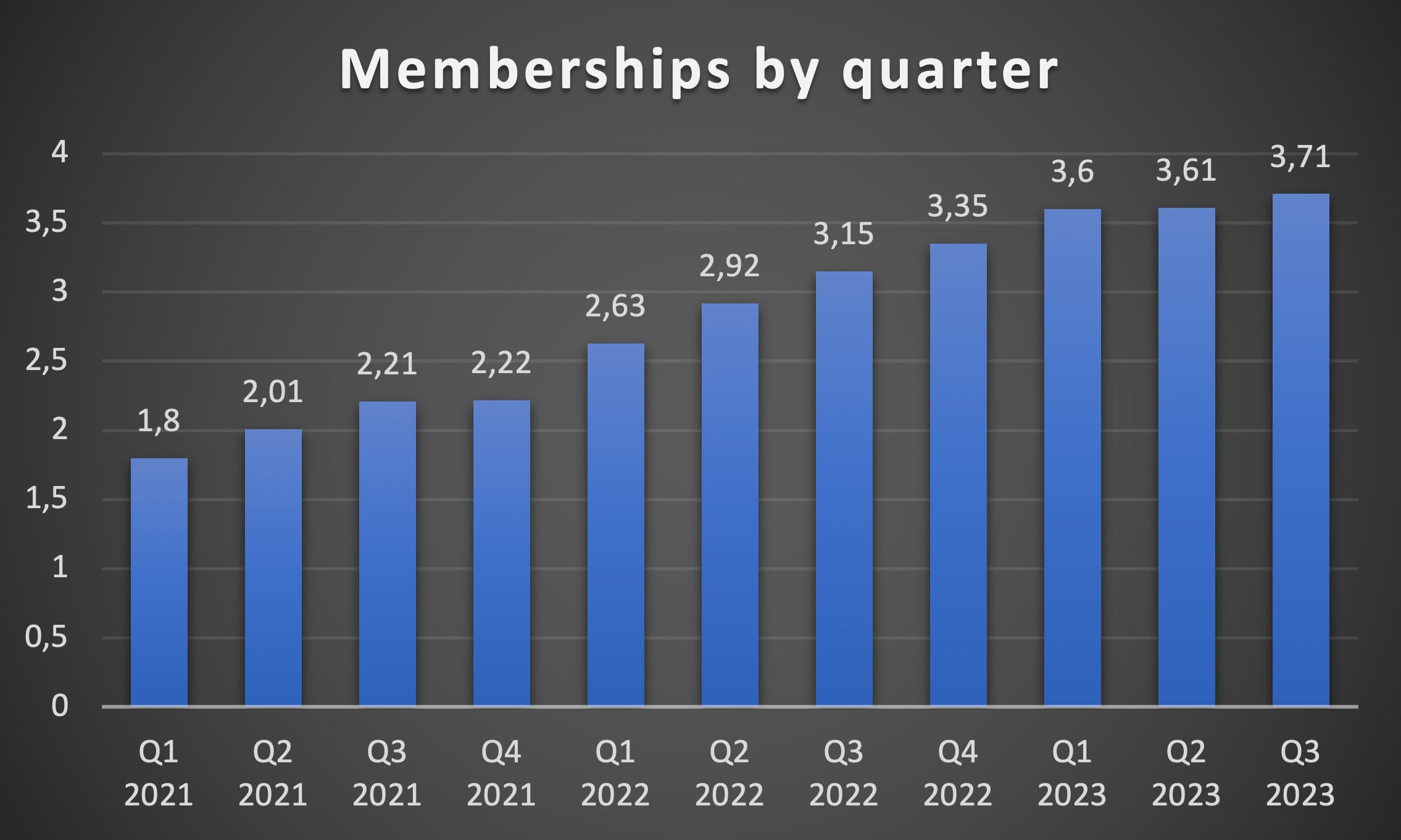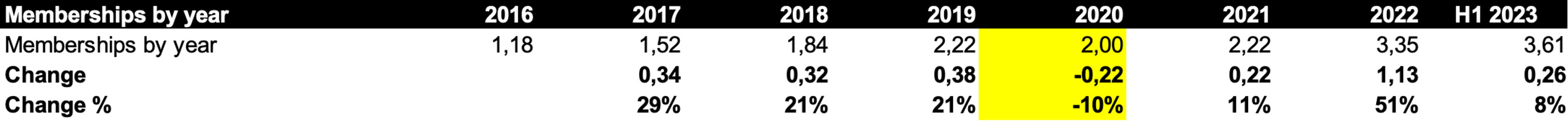 La empresa ha conseguido crecer su base de miembros a un muy buen ritmo, llegando a un CAGR del 19% de 2016 a 2022, y pasando entre medias por el COVID.