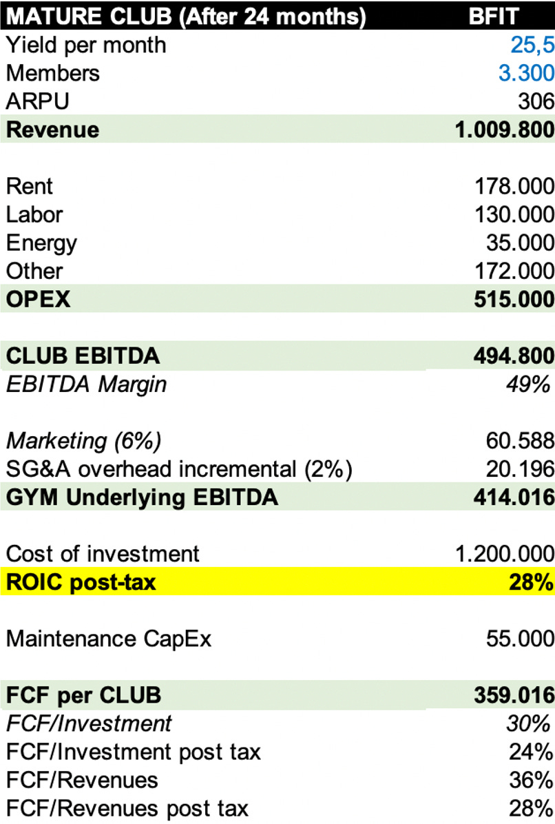 En general, todas estas grandes cadenas como Planet Fitness o Gym Group, incluido BFIT, buscan tener un retorno del 30% sobre los clubes en su primer año de maduración. Y ya hemos dicho que se define un gimnasio como maduro cuando lleva abierto más de dos años.
