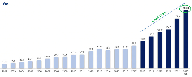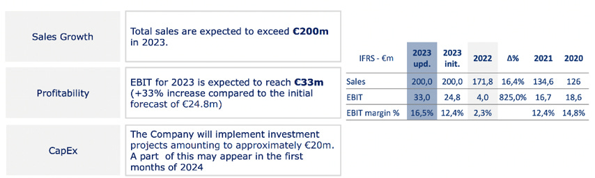 El equipo gestor parece bastante conservador puesto que han subido ya varias veces el guidance. Este año esperaban 200 millones en ventas, es decir, un incremento del 16% para 2023 y un EBIT de 25 millones, es decir, un margen del 12,4%.