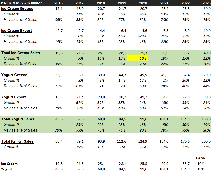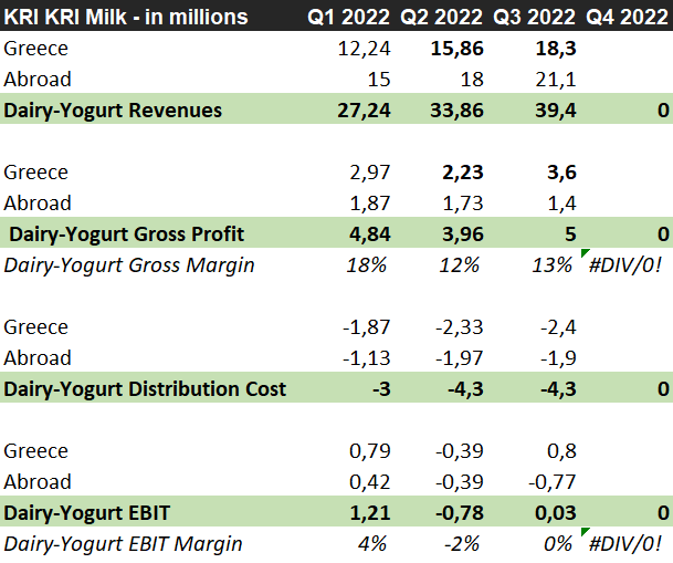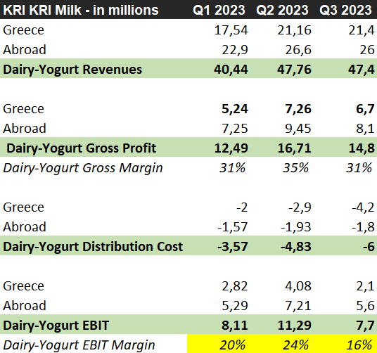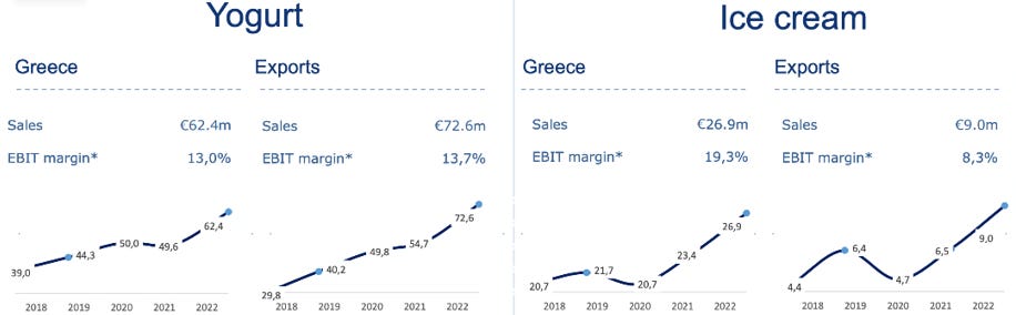 Los yogures se venden ya más fuera que en la propia Grecia y estos tienen incluso mejores márgenes que el propio segmento local y que los helados. Recordemos que la mayoría se venden como marcas privadas o private label, en concreto el 80-85% de las ventas fuera de Grecia.