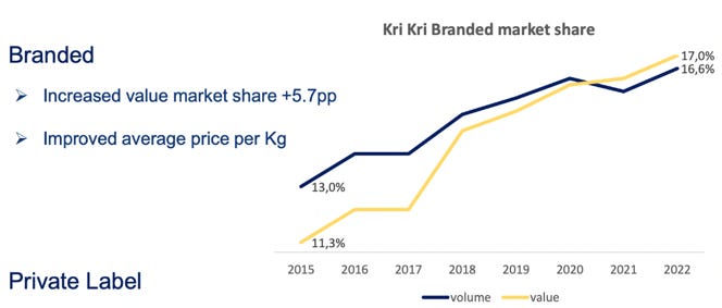 Kri Kri ha tenido crecimientos excelentes los últimos años con un CAGR del 16,2% de 2018 a 2023, lo cual es impresionante para una empresa de este segmento.