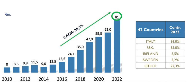 Su exportación se centra sobre todo en Europa, vendiendo el 42% a Italia y el 22% a UK.
