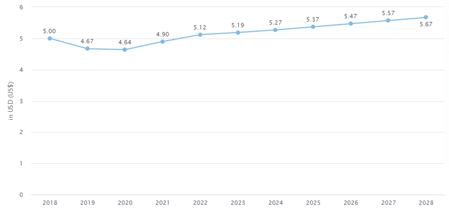 En Grecia, los ingresos en el mercado del yogur ascenderán a $480 millones en 2024. Se espera que el mercado crezca anualmente un 3,93% (CAGR 2024-2028). Aproximadamente un 1,78% de 2023 a 2028 vendrá por subida de precio y un 2% por volumen.