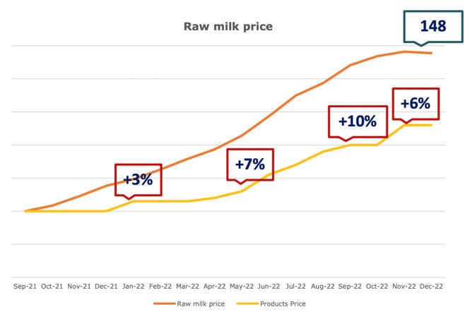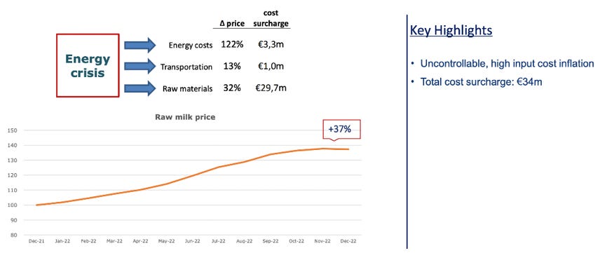 A parte de los costes energéticos, lo más importante por lo que la empresa no pudo mantener los márgenes fue que el precio de la leche se le disparo.