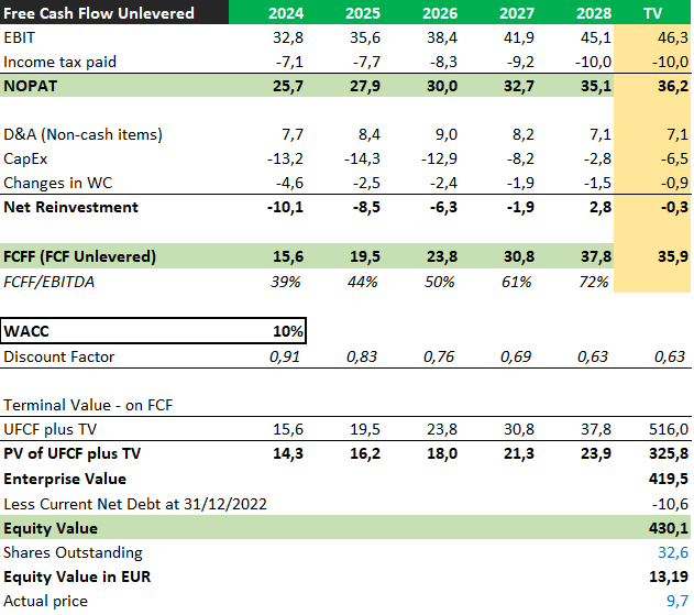 Manteniendo un margen EBIT 15% (que tendré que estudiar con mayor profundidad) porque considero que el equipo gestor está siendo muy conservador)